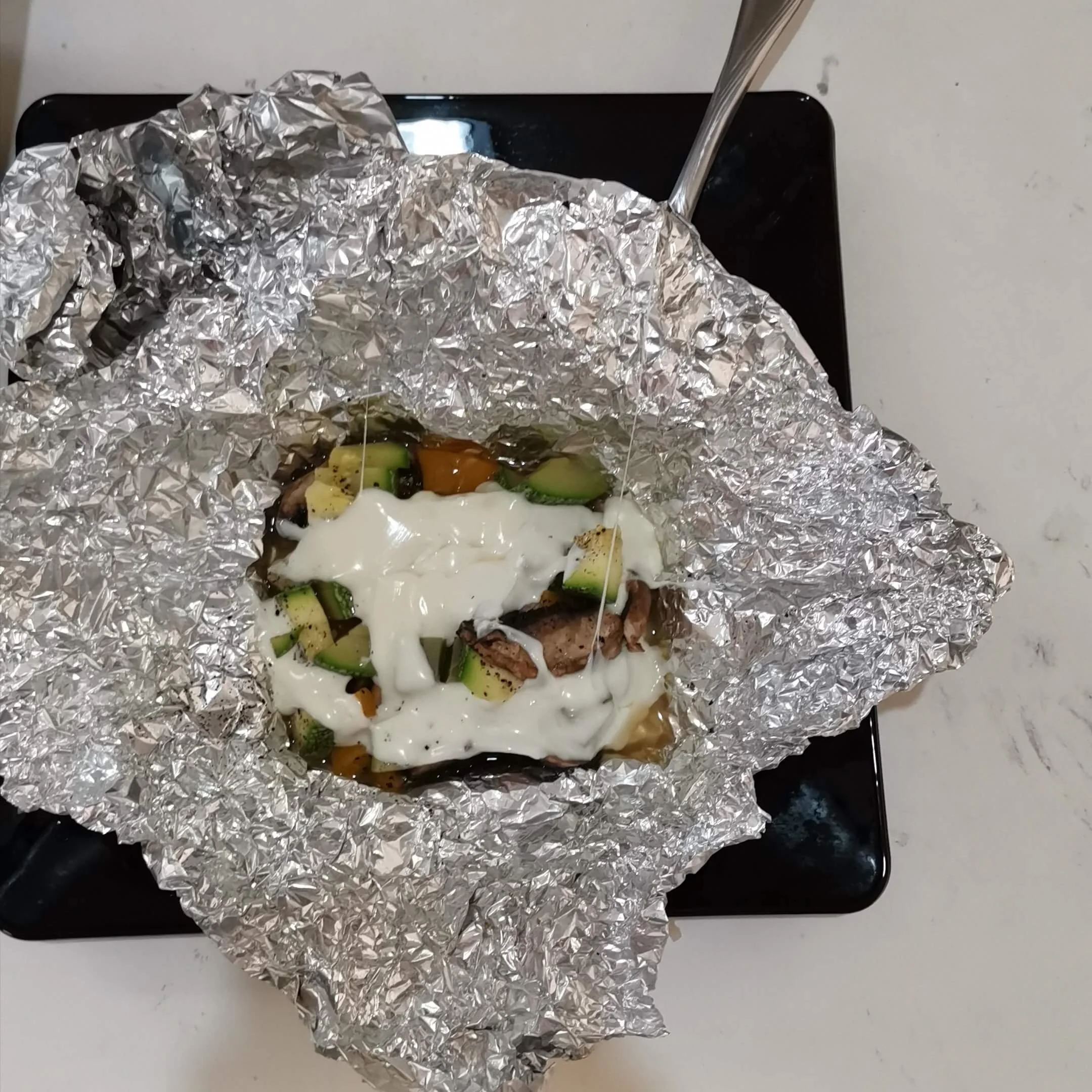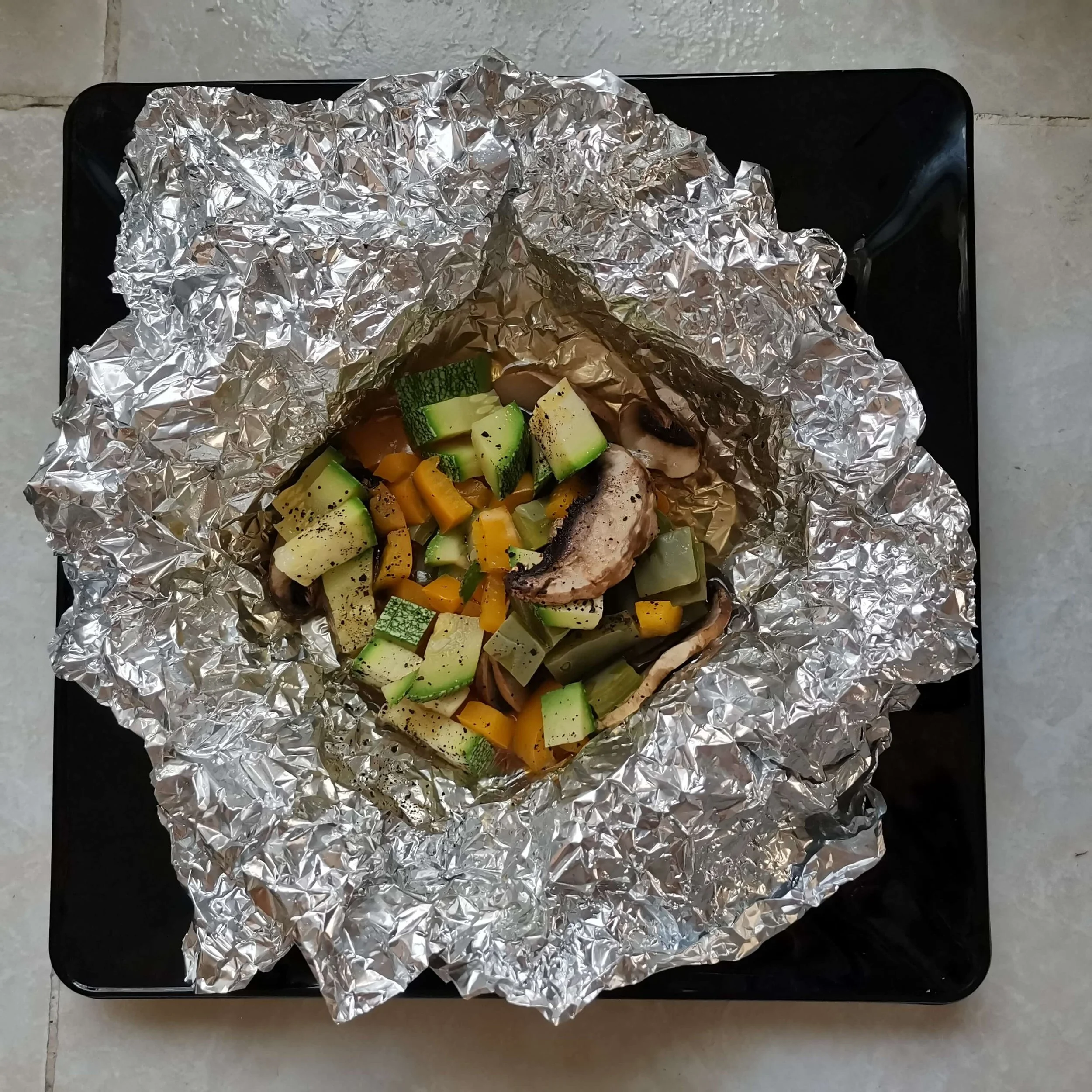 3.- En una hoja de papel alumnio, previamente engrasado con el aceite en spray o líquido coloca un poco de cada verdura y agrega un poco de sal y pimienta.
